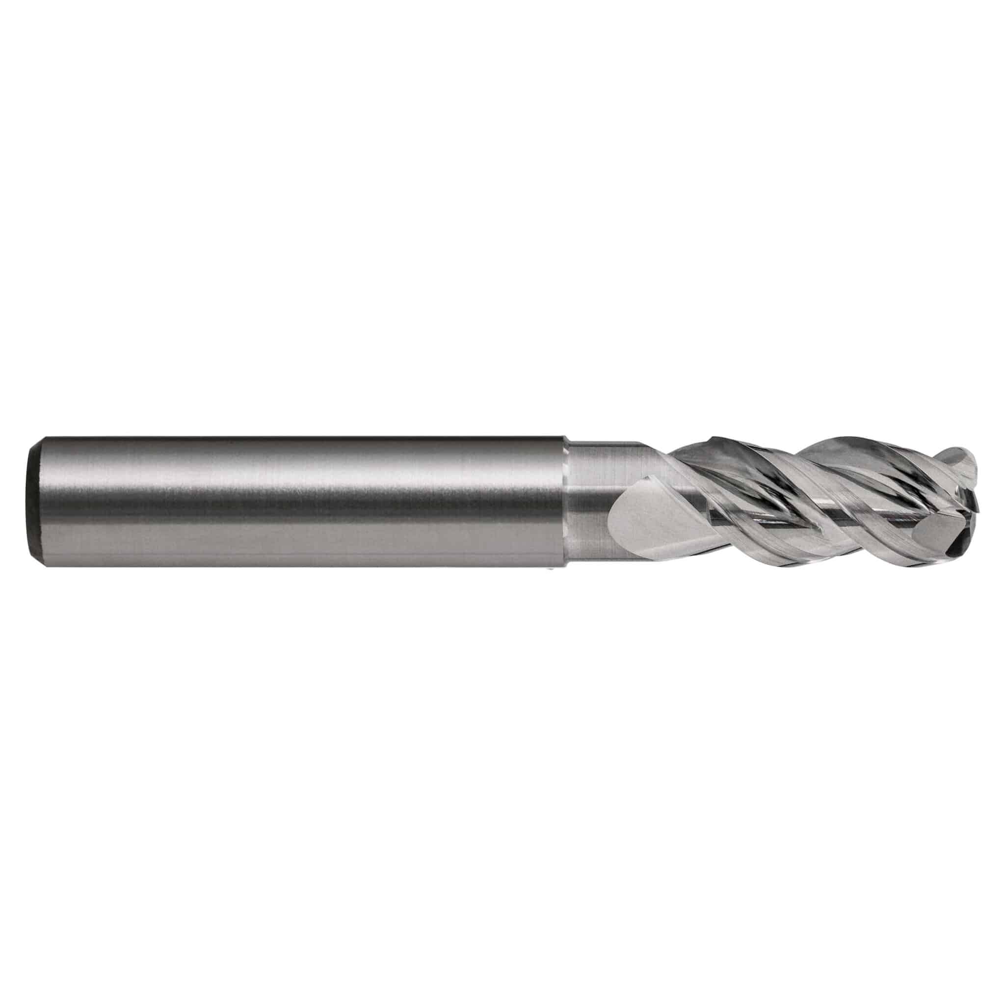 We also have three and four-flute carbide endmills. For example chamfered, ball nose, straight end, and corner radius.
